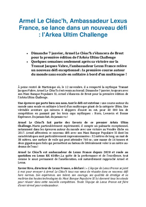 Constructeurs 20 décembre 2023 - 10:29 Quelques semaines seulement après sa victoire sur la Transat Jacques Vabre, l’ambassadeur Lexus France relève un nouveau défi exceptionnel : la première course autour du monde sans escale en solitaire à bord d’un multicoque. PDF (161 Ko) Télécharger