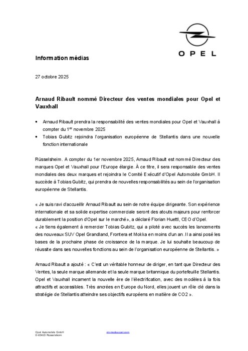 À compter du 1er novembre 2025, Arnaud Ribault est nommé Directeur des marques Opel et Vauxhall pour l’Europe élargie. À ce titre, il sera responsable des ventes mondiales des deux marques et rejoindra le Comité Exécutif d’Opel Automobile GmbH. Il succède à Tobias Gubitz, qui prendra de nouvelles responsabilités au sein de l’organisation européenne de Stellantis.