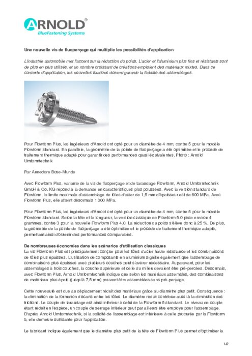 L'industrie automobile met l'accent sur la réduction du poids. L'acier et l'aluminium plus fins et résistants sont de plus en plus utilisés, et un nombre croissant de créations emploient des matériaux mixtes. Dans ce contexte d'application, les nouvelles fixations doivent garantir la fiabilité des assemblages. Pour Flowform Plus, les ingénieurs d'Arnold ont opté pour un diamètre de 4 mm, contre 5 pour le modèle Flowform standard...