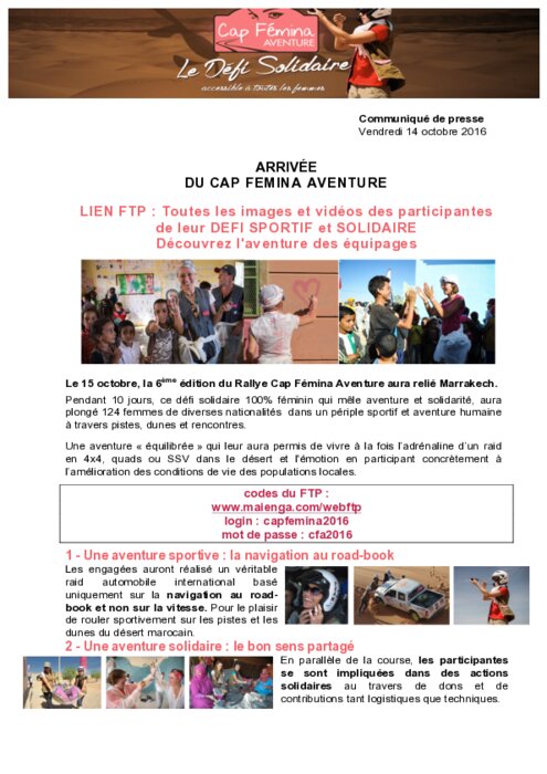 Le 15 octobre, la 6ème édition du Rallye Cap Fémina Aventure aura relié Marrakech. Pendant 10 jours, ce défi solidaire 100% féminin qui mêle aventure et solidarité, aura plongé 124 femmes de diverses nationalités dans un périple sportif et aventure humaine à travers pistes, dunes et rencontres.