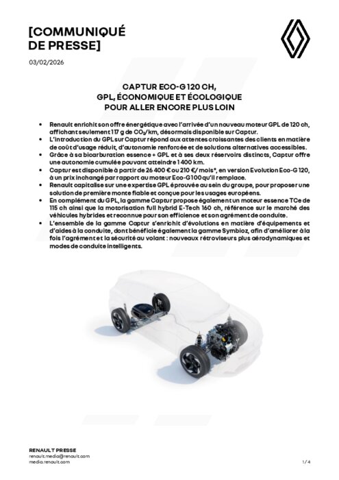 Adapté du moteur essence TCe 115 1,2 litre (HR12) turbo à injection directe de 3 cylindres, la nouvelle motorisation bicarburation essence/ GPL renforce l’offre de Renault répondant ainsi aux attentes des clients à la recherche de plus de polyvalence, tout en conservant des coûts d’usage optimisés. Le moteur Eco-G 120 bénéficie d’évolutions techniques lui permettant d’atteindre une puissance de 120 ch, (soit un gain de 20 ch), ainsi qu’un couple maximal de 200 Nm, (soit une hausse de 30 Nm).
