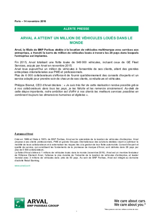 Services 15 novembre 2016 - 09:02 Arval, la filiale de BNP Paribas dédiée à la location de véhicules multimarques avec services aux entreprises, a franchi la barre du million de véhicules loués à travers les 28 pays dans lesquels l’entreprise est implantée. PDF (65 Ko) Télécharger