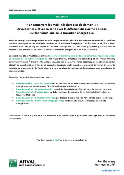 Arval France diffuse le sixième et dernier épisode de la série portant sur l’approche conseil en matière de transition énergétique, par Régis Masera, Directeur du consulting et de l’Arval Mobility Observatory France. À travers cette vidéo, découvrez comment Arval France accompagne ses clients dans leur objectif de décarbonation grâce à une approche structurée multi-expertise qui permet de mener à bien cette conduite du changement ; de l’audit client à la mise en place de solutions et d’indicateurs pour un pilotage du plan de mobilité.