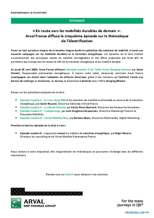 Services 26 avril 2024 - 17:50 « En route vers les mobilités durables de demain » : Le 25 avril 2024, Arval France diffusait l’épisode numéro 5 sur l’offre Arval Charging Services par Sonia Chebini, Responsable partenariats énergétiques. PDF (149 Ko) Télécharger ARVAL extrait vidéo
