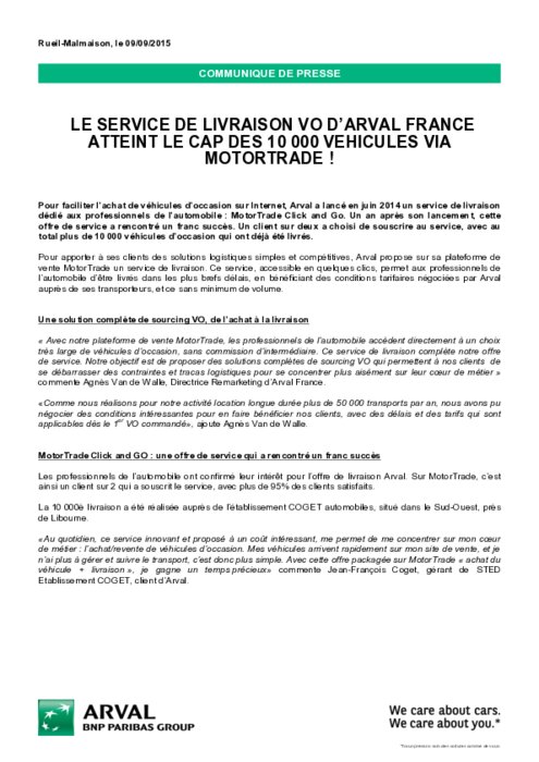 Pour faciliter l’achat de véhicules d’occasion sur Internet, Arval a lancé en juin 2014 un service de livraison dédié aux professionnels de l’automobile : MotorTrade Click and Go. Un an après son lancement, cette offre de service a rencontré un franc succès. Un client sur deux a choisi de souscrire au service, avec au total plus de 10 000 véhicules d’occasion qui ont déjà été livrés.