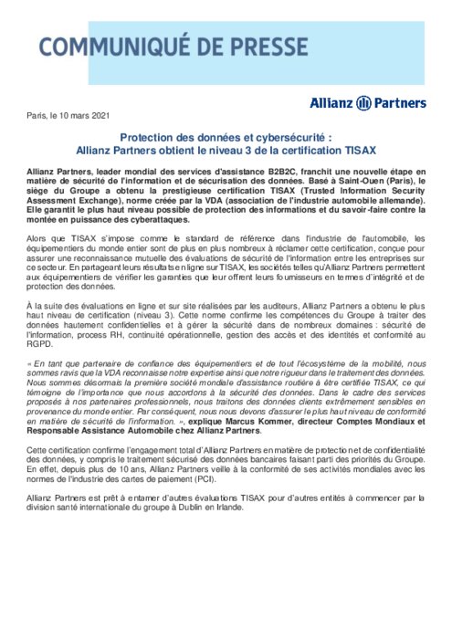 Allianz Partners, leader mondial des services d'assistance B2B2C, franchit une nouvelle étape en matière de sécurité de l’information et de sécurisation des données. Basé à Saint-Ouen (Paris), le siège du Groupe a obtenu la prestigieuse certification TISAX (Trusted Information Security Assessment Exchange), norme créée par la VDA (association de l'industrie automobile allemande). Elle garantit le plus haut niveau possible de protection des informations et du savoir-faire...
