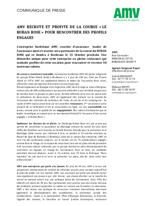 L’entreprise bordelaise AMV, courtier d’assurance leader de l’assurance moto et scooter sera partenaire de la course du RUBAN ROSE qui se tiendra à Bordeaux le 15 Octobre prochain. Une démarche unique pour cette entreprise en pleine croissance qui souhaite profiter de cette occasion pour rencontrer et recruter 50 nouveaux talents.