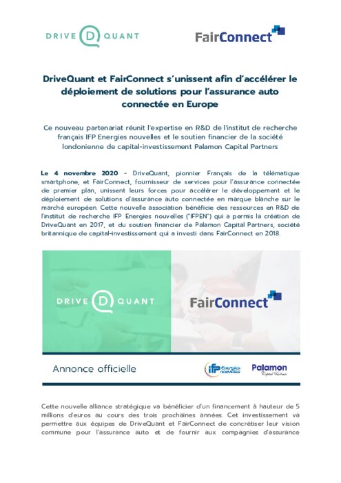 DriveQuant, pionnier Français de la télématique smartphone, et FairConnect, fournisseur de services pour l'assurance connectée de premier plan, unissent leurs forces pour accélérer le développement et le déploiement de solutions d'assurance auto connectée en marque blanche sur le marché européen. Cette nouvelle association bénéficie des ressources en R&D de l'institut de recherche IFP Energies nouvelles ("IFPEN") qui a permis la création de DriveQuant en 2017...