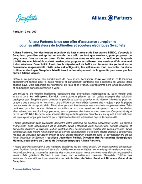 Allianz Partners, l’un des leaders mondiaux de l'assistance et de l'assurance B2B2C, s’associe à Swapfiets, première entreprise au monde de « vélo en tant que service », pour proposer un programme d’assurance européen. Cette couverture assurantielle sera disponible sur la quasi-totalité des marchés où la société néerlandaise propose actuellement ses services d’abonnement à des solutions d'e-mobilité...