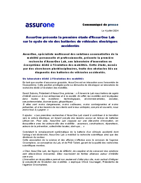 AssurOne, spécialiste multicanal des solutions assurantielles de la mobilité personnelle et professionnelle, présente la première recherche d’AssurOne Lab, son laboratoire d’innovation en écosystème dédié à l’évolution des mobilités. Cette étude, menée par des chercheurs pluridisciplinaires, traite des obstacles liés au diagnostic des batteries de véhicules accidentés.