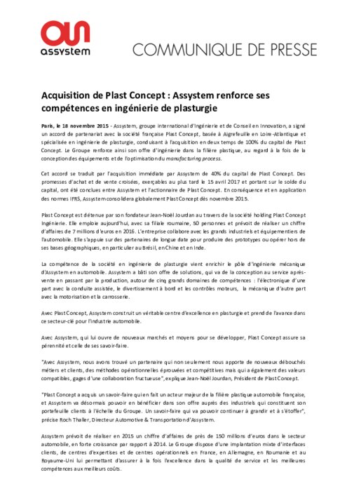 Assystem, groupe international d’Ingénierie et de Conseil en Innovation, a signé un accord de partenariat avec la société française Plast Concept, basée à Aigrefeuille en Loire-Atlantique et spécialisée en ingénierie de plasturgie, conduisant à l’acquisition en deux temps de 100% du capital de Plast Concept. Le Groupe renforce ainsi son offre d'ingénierie dans la filière plastique, au regard à la fois de la conception des équipements et de l’optimisation du manufacturing process.