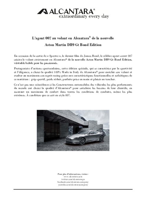 A l'occasion de la sortie de « Spectre », le dernier film de James Bond, le célèbre agent secret 007 saisira le volant strictement en Alcantara de la nouvelle Aston Martin DB9 Gt Bond Edition, véritable bolide pour les passionnés.