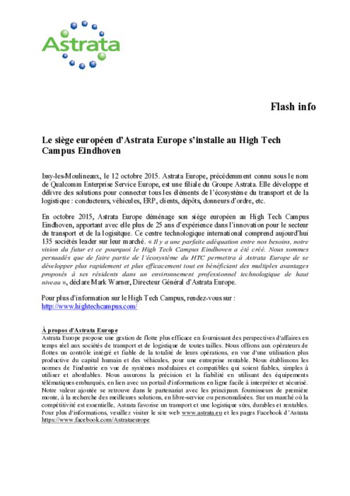 Astrata Europe, précédemment connu sous le nom de Qualcomm Enterprise Service Europe, est une filiale du Groupe Astrata. Elle développe et délivre des solutions pour connecter tous les éléments de l’écosystème du transport et de la logistique : conducteurs, véhicules, ERP, clients, dépôts, donneurs d’ordre, etc.
