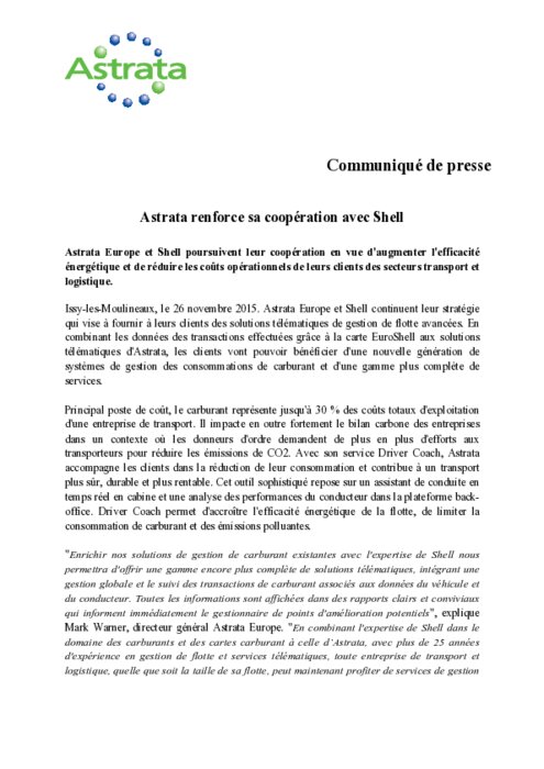 Astrata Europe et Shell continuent leur stratégie qui vise à fournir à leurs clients des solutions télématiques de gestion de flotte avancées. En combinant les données des transactions effectuées grâce à la carte EuroShell aux solutions télématiques d'Astrata, les clients vont pouvoir bénéficier d'une nouvelle génération de systèmes de gestion des consommations de carburant et d'une gamme plus complète de services.