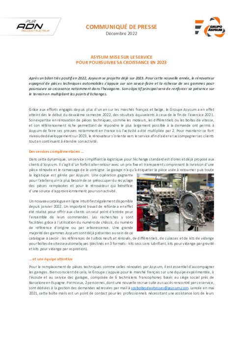 Après un bilan très positif en 2022, Asysum se projette déjà sur 2023. Pour cette nouvelle année, le rénovateur espagnol de pièces techniques automobiles s’appuie sur son savoir-faire et la richesse de ses gammes pour poursuivre sa croissance notamment dans l’hexagone. Son objectif principal sera de renforcer sa présence sur le terrain en multipliant les points d’échanges.