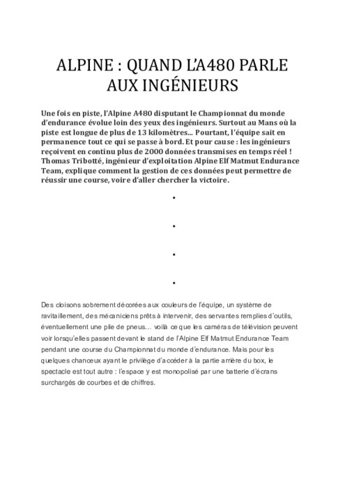 Une fois en piste, l’Alpine A480 disputant le Championnat du monde d’endurance évolue loin des yeux des ingénieurs. Surtout au Mans où la piste est longue de plus de 13 kilomètres… Pourtant, l’équipe sait en permanence tout ce qui se passe à bord. Et pour cause : les ingénieurs reçoivent en continu plus de 2000 données transmises en temps réel ! Thomas Tribotté, ingénieur d’exploitation Alpine Elf Matmut Endurance Team, explique la gestion de ces données.