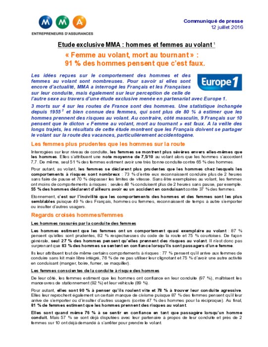 Les idées reçues sur le comportement des hommes et des femmes au volant sont nombreuses. Pour savoir si elles sont encore d’actualité, MMA a interrogé les Français et les Françaises sur leur conduite, mais également sur leur perception de celle de l’autre sexe au travers d’une étude exclusive menée en partenariat avec Europe 1.