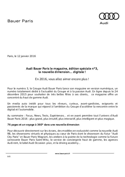 Pour le numéro 3, le Groupe Audi Bauer Paris lance son magazine en version numérique, un numéro totalement dédié à l'actualité du Groupe et à la passion Audi. En ligne depuis le 24 décembre 2015 pour souhaiter de très belles fêtes à ses clients, ce magazine offre un concentré du haut de gamme Audi.