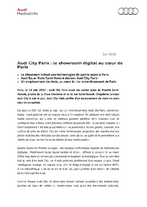 Constructeurs 14 juin 2016 - 11:29 Audi City Paris ouvre ses portes place du Marché Saint-Honoré, proche de la Place Vendôme et de la rue Saint-Honoré. Cinquième concept Audi City à voir le jour, Audi City Paris profite d’un emplacement de choix en plein cœur de la capitale. PDF (403 Ko) Télécharger