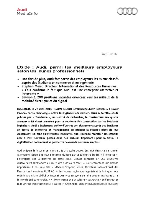 L’ADN de Audi « Vorsprung durch Technik », à savoir l’avance par la technologie, attire les ingénieurs de demain. Dans la dernière étude publiée par « Trendence », un institut de recherches, le constructeur aux quatre anneaux a été classé première pour la neuvième fois consécutive par les étudiants ingénieurs. Audi a également profité d’un très bon classement auprès des étudiants en écoles de commerce et management, en prenant la seconde place de leur classement.