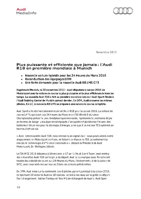 Audi disputera la saison 2016 de Motorsport avec la voiture de course la plus puissante et la plus efficience de tous les temps. La nouvelle Audi R18 a fait sa première mondiale lors de l’Audi Sport Finale à l’Audi Training Center de Munich samedi dernier. En DTM, Audi conserve les mêmes pilotes. En GT, la nouvelle R8 LMS se prépare à une saison de course complète.
