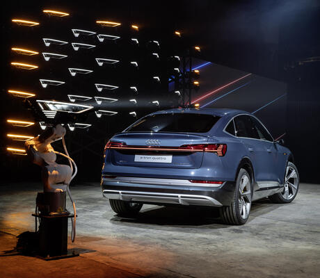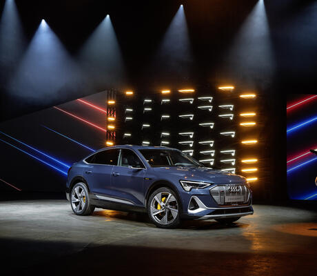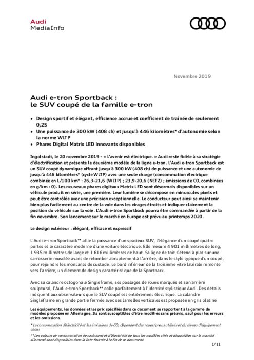 " L’avenir est électrique. " Audi reste fidèle à sa stratégie d’électrification et présente le deuxième modèle de la ligne e-tron. L’Audi e-tron Sportback est un SUV coupé dynamique offrant jusqu’à 300 kW (408 ch) de puissance et une autonomie de jusqu’à 446 kilomètres (cycle WLTP) avec une seule charge (consommation électrique combinée en L/100 km : 26,3-21,6 (WLTP) ; 23,9-20,6 (NEFZ) ; émissions de CO2 combinées en g/km : 0)...