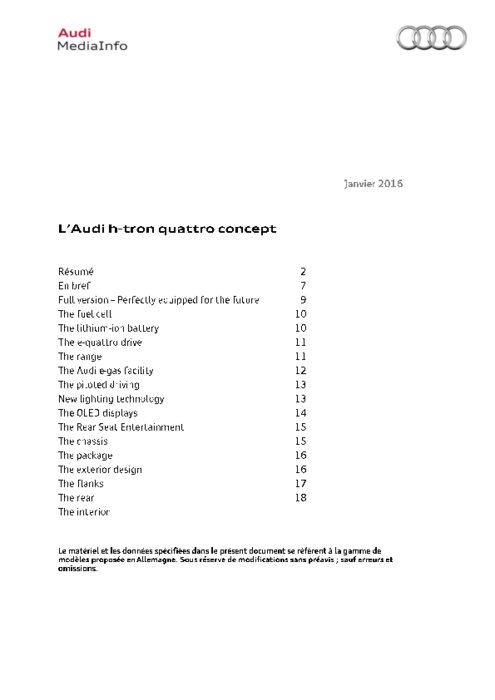 Design valorisant, ravitaillement rapide et performances sportives peuvent décrire l'Audi h-tron quattro concept. Cette voiture unique combine une pile à combustible pouvant atteindre jusqu'à 110 kW (150 ch) avec une puissante batterie capable de fournir un surplus temporaire de 100 kW (136 ch). Le véhicule peut être entièrement ravitaillé en hydrogène en environ quatre minutes, ce qui lui permet de parcourir jusqu'à 600 kilomètres.