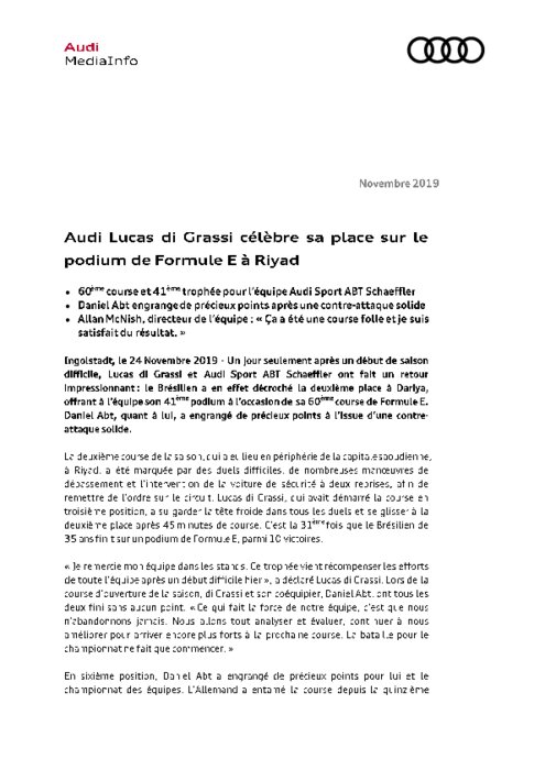Un jour seulement après un début de saison difficile, Lucas di Grassi et Audi Sport ABT Schaeffler ont fait un retour impressionnant : le Brésilien a en effet décroché la deuxième place à Dariya, offrant à l’équipe son 41ème podium à l’occasion de sa 60ème course de Formule E. Daniel Abt, quant à lui, a engrangé de précieux points à l’issue d’une contre-attaque solide.