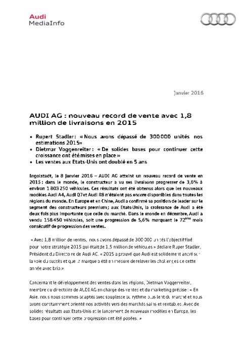 AUDI atteint un nouveau record de vente en 2015 : dans le monde, le constructeur a vu ses livraisons progresser de 3,6% à environ 1 803 250 véhicules. Ces résultats ont été obtenus alors que les nouveaux modèles Audi A4, Audi Q7et Audi R8 n’étaient pas encore disponibles dans toutes les régions du monde. En Europe et en Chine, Audi a confirmé sa position de leader sur le segment des constructeurs premium ; aux Etats-Unis, la croissance de Audi a été deux fois plus importante que celle du marché.