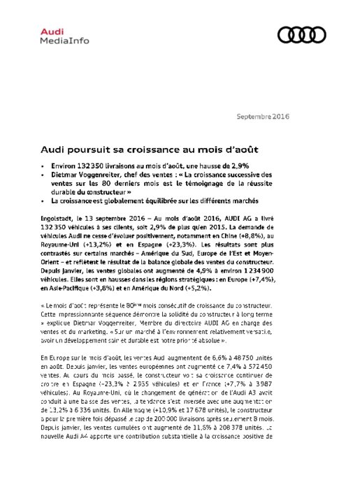 Au mois d’août 2016, AUDI a livré 132 350 véhicules à ses clients, soit 2,9% de plus qu’en 2015. La demande de véhicules Audi ne cesse d’évoluer positivement, notamment en Chine (+8,8%), au Royaume-Uni (+13,2%) et en Espagne (+23,3%). Les résultats sont plus contrastés sur certains marchés – Amérique du Sud, Europe de l’Est et Moyen-Orient – et reflètent le résultat de la balance globale des ventes du constructeur.
