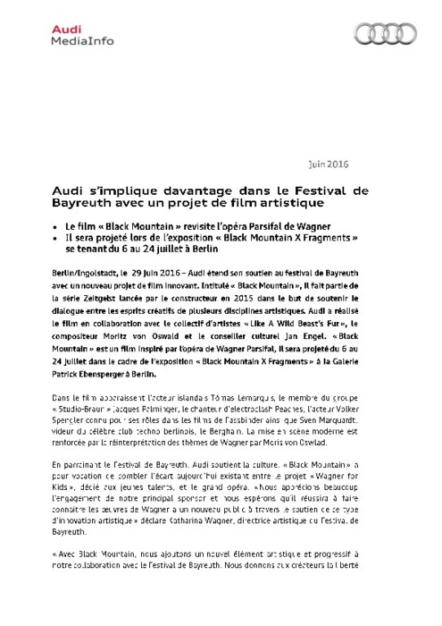 Audi étend son soutien au festival de Bayreuth avec un nouveau projet de film innovant. Intitulé " Black Mountain ", il fait partie de la série Zeitgeist lancée par le constructeur en 2015 dans le but de soutenir le dialogue entre les esprits créatifs de plusieurs disciplines artistiques. Audi a réalisé le film en collaboration avec le collectif d’artistes " Like A Wild Beast’s Fur ", le compositeur Moritz von Oswald et le conseiller culturel Jan Engel.