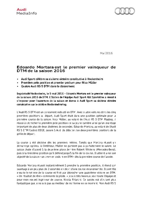 Edoardo Mortara est le premier vainqueur de la saison 2016 de DTM. L’Italien de l’équipe Audi Sport Abt Sportsline a réussi à s’imposer pour l’ouverture de la saison et donne à Audi Sport sa sixième victoire consécutive sur le célèbre Hockenheimring. L’Audi RS 5 DTM est un concurrent redouté en DTM. Avec quatre voitures dans les cinq premières positions au départ, Audi Sport était dans une position optimale pour la première course de la saison.
