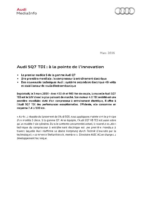 Avec 435 ch et 900 Nm de couple, la nouvelle Audi SQ7 TDI est le SUV diesel le plus puissant du marché. Son moteur 4.0 TDI revisité est une première mondiale : doté d’un compresseur à entrainement électrique, il offre à l’Audi SQ7 TDI des performances exceptionnelles. Efficiente, elle consomme en moyenne 7.4 L/100 km.