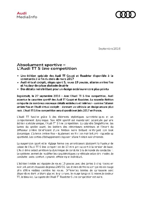 Avec l’Audi TT S line competition, Audi accentue le caractère sportif des Audi TT Coupé et Roadster. La nouvelle finition comporte de nombreux nouveaux détails extérieurs et intérieur – comme l’aileron arrière fixe et l’Audi virtual cockpit - donnant un véhicule un design encore plus racé. L’Audi TT S line competition sera disponible en juin 2017 en France.