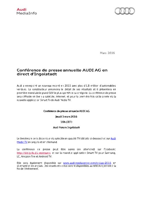 Audi a enregistré un nouveau record en 2015 avec plus d’1,8 million d’automobiles vendues. Le constructeur annoncera le détail de ses résultats et il présentera en première mondiale le grand SUV le plus sportif de sa catégorie. La conférence de presse sera diffusée en live via satellite, internet, et pour la première fois cette année via la nouvelle application Smart Tv de Audi Media TV.