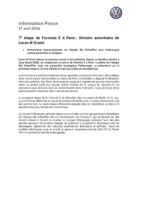 Lucas di Grassi ajoute un nouveau succès à son palmarès, depuis sa dernière victoire à Long Beach, en remportant la course de Formule E à Paris. Le pilote de l’équipe Abt Schaeffler, avec son partenaire stratégique Volkswagen, se présentera sur la prochaine étape le 21 mai à Berlin en tant que leader du championnat. Lucas di Grassi a posé les fondations de sa quatrième victoire en Formule E dès le départ de la course autour des Invalides au centre de Paris.