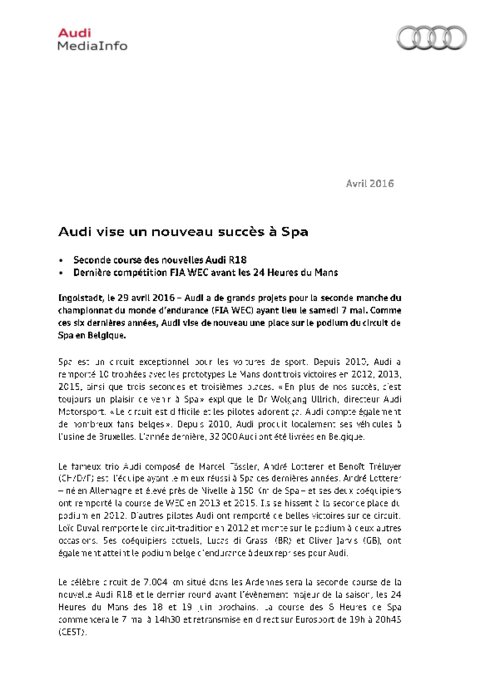Audi a de grands projets pour la seconde manche du championnat du monde d’endurance (FIA WEC) se tenant le samedi 7 mai. Comme ces six dernières années, Audi vise de nouveau une place sur le podium du circuit de Spa en Belgique. Spa est un circuit exceptionnel pour les voitures de sport. Depuis 2010, Audi a remporté 10 trophées avec les prototypes Le Mans dont trois victoires en 2012, 2013, 2015, ainsi que trois secondes et troisièmes places.