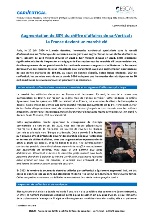 L'année dernière, l’entreprise carVertical, spécialisée dans le recueil d'informations sur l'historique des véhicules, a enregistré une augmentation de son chiffre d’affaires de 83 %, passant de 23,3 millions d'euros en 2022 à 42,7 millions d'euros en 2023.