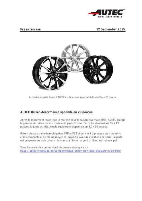 Equipementiers 22 septembre 2025 - 14:42 Après le lancement réussi sur le marché pour la saison hivernale 2024, Autec élargit la gamme de tailles de son modèle de jante Brixen : outre les dimensions 16 à 19 pouces, la jante est désormais également disponible en 8,0 x 20 pouces. PDF (168 Ko) Télécharger credit Autec
