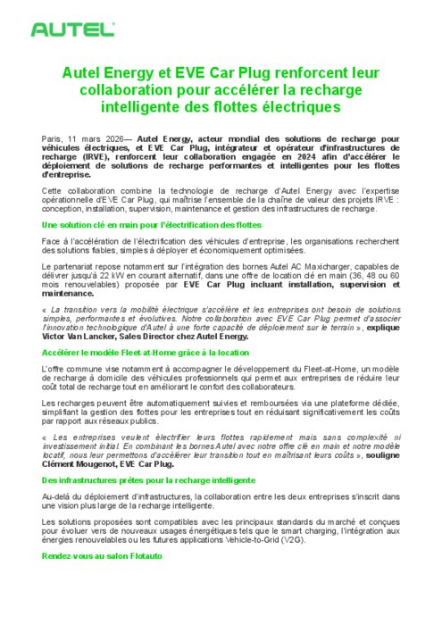 Autel Energy, acteur mondial des solutions de recharge pour véhicules électriques, et EVE Car Plug, intégrateur et opérateur d’infrastructures de recharge (IRVE), renforcent leur collaboration engagée en 2024 afin d’accélérer le déploiement de solutions de recharge performantes et intelligentes pour les flottes d’entreprise.