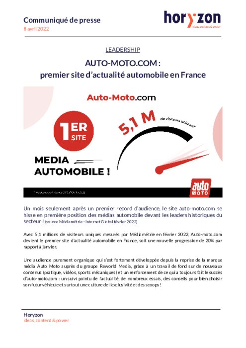 Un mois seulement après un premier record d’audience, le site auto-moto.com se hisse en première position des médias automobile devant les leaders historiques du secteur ! Avec 5,1 millions de visiteurs uniques mesurés par Médiamétrie en février 2022, Auto-moto.com devient le premier site d’actualité automobile en France, soit une nouvelle progression de 20% par rapport à janvier...