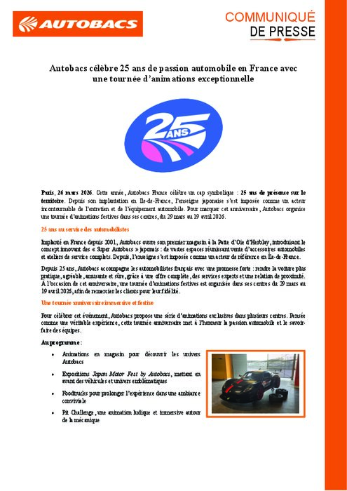 Cette année, Autobacs France célèbre un cap symbolique : 25 ans de présence sur le territoire. Depuis son implantation en Ile-de-France, l’enseigne japonaise s’est imposée comme un acteur incontournable de l’entretien et de l’équipement automobile. Pour marquer cet anniversaire, Autobacs organise une tournée d’animations festives dans ses centres, du 29 mars au 19 avril 2026.
