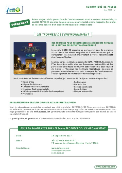 Soutenu par des institutions comme le CNPA, l’ADEME, l’Agence de l’Eau Seine-Normandie, ainsi que les marques automobiles et des partenaires-collecteurs d’AUTOECO, cet événement a pour objectif de mettre à l’honneur les meilleurs réparateurs, marques et groupes automobiles œuvrant pour le respect de l’environnement avec une gestion de déchets automobiles responsable.