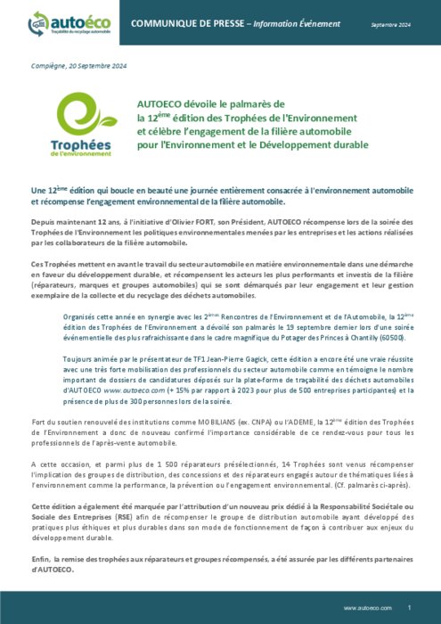 Autoéco dévoile le palmarès de la 12ème édition des Trophées de l'Environnement