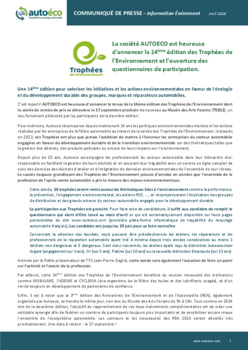 Autoéco est heureuse d'annoncer la tenue de la 14ème édition des Trophées de l'Environnement dont la soirée de remise de prix se déroulera le 17 septembre prochain de nouveau au Musée des Arts Forains (75012), un lieu fortement plébiscité par les participants de la dernière édition