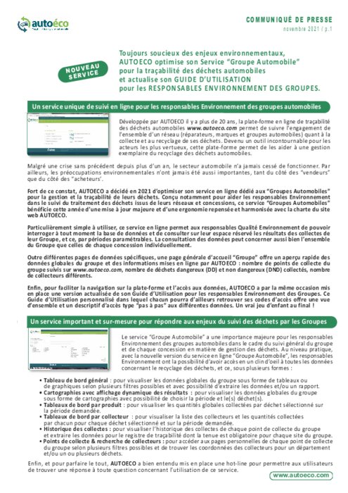 Fort de ce constat, AUTOECO a décidé en 2021 d’optimiser son service en ligne dédié aux “Groupes Automobiles” pour la gestion et la traçabilité de leurs déchets. Conçu notamment pour aider les responsables Environnement dans le suivi du traitement des déchets issus de leurs réseaux et concessions, ce service “Groupes Automobiles” bénéficie cette année d’une mise à jour majeure et d’une ergonomie repensée et harmonisée avec la charte du site web AUTOECO.