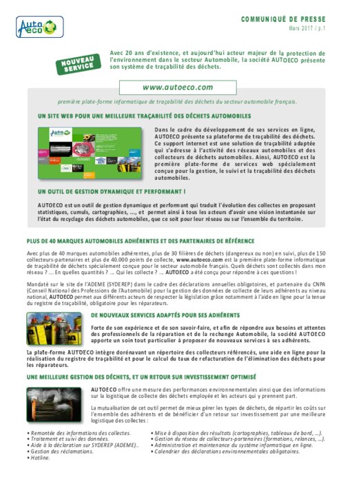 Dans le cadre du développement de ses services en ligne, AUTOECO présente sa plateforme de traçabilité des déchets. Ce support internet est une solution de traçabilité adaptée qui s'adresse à l'activité des réseaux automobiles et des collecteurs de déchets automobiles. Ainsi, AUTOECO est la première plate-forme de services web spécialement conçue pour la gestion, le suivi et la traçabilité des déchets automobiles.