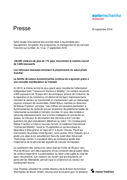 En 2016, le thème central du plus grand salon mondial de l’aftermarket indépendant était "Tomorrow’s Service & Mobility". Un nombre record de 4.820 exposants de 76 pays dont les principaux acteurs de l’industrie, de la réparation et du commerce ont démontré de façon impressionnante comment le secteur se transformait en s'acheminant vers un réseautage toujours croissant de l’automobile. La satisfaction des visiteurs du salon était de l’ordre de 95 pour cent.
