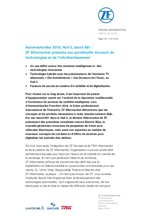 Pour réussir sur le long terme, il est important de passer d’équipementier centré sur l’activité de la réparation traditionnelle à fournisseur de services de mobilité intelligente. Lors d’Automechanika Francfort 2018, le Salon professionnel international de l'industrie, ZF Aftermarket démontrera que les concepts et les produits nécessaires à cette réussite existent déjà. Sur son stand A91 dans le Hall 3, la division Aftermarket de ZF, présentera des premières mondiales comme Electric Blue...