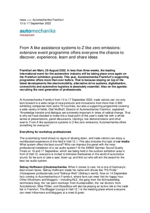 Dans moins de trois semaines, le leader des salons de l'après-vente auto aura lieu à nouveau au parc des expositions de Francfort. Parmi les thèmes-clés : électromobilité, systèmes de propulsion alternatifs, la digitalisation, la connectivité et la logistique automobile. Sans oublier les formations et le recrutement...